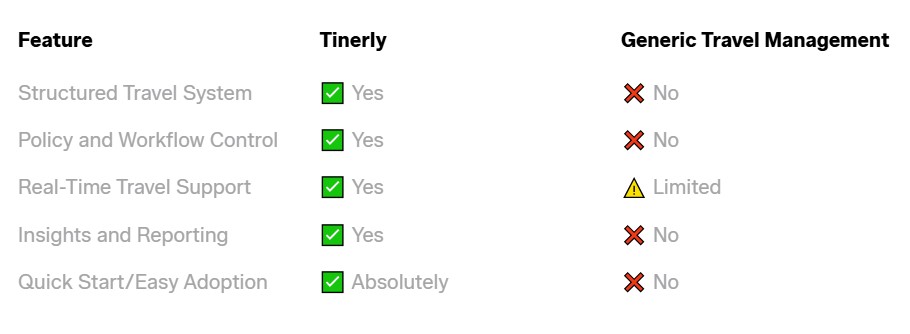 We started Tinerly because we kept seeing professionals struggle with travel that should’ve been simple. What we do closes that gap — giving teams the tools, policies, and guidance to make every trip efficient, predictable, and stress-free.